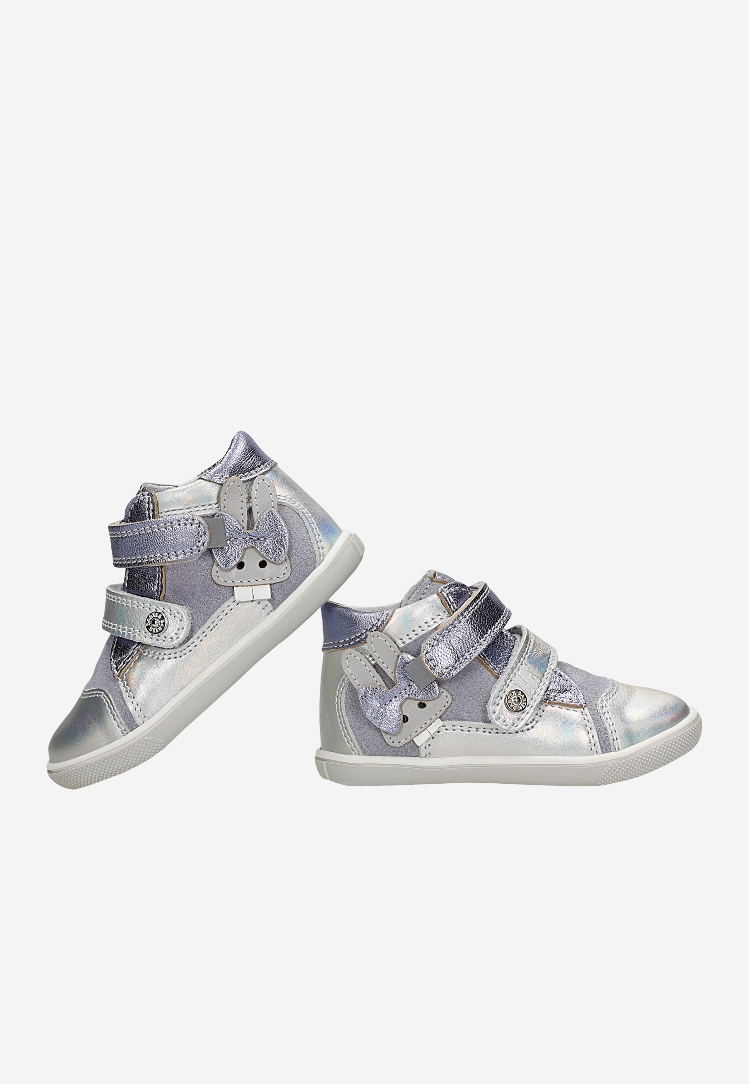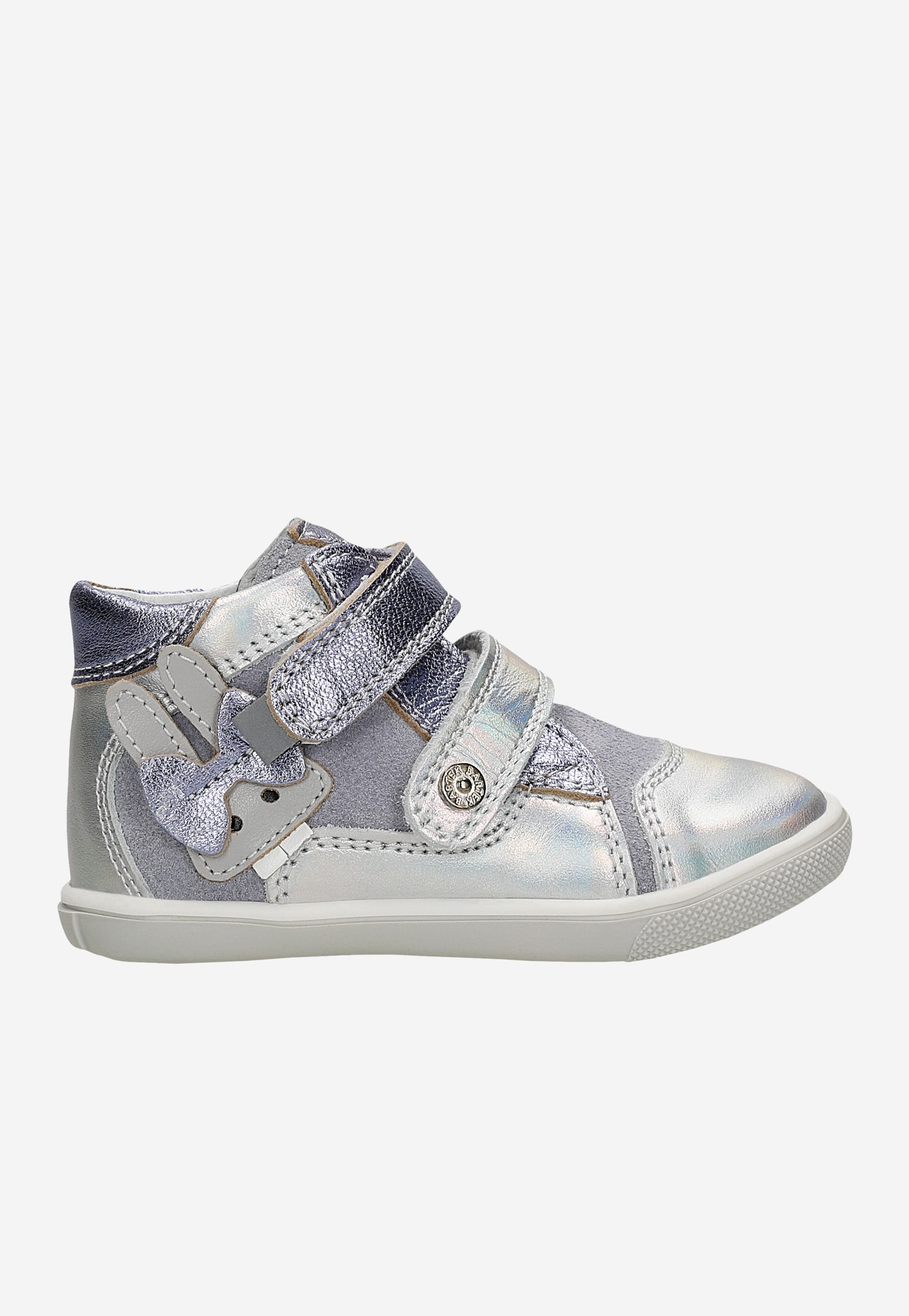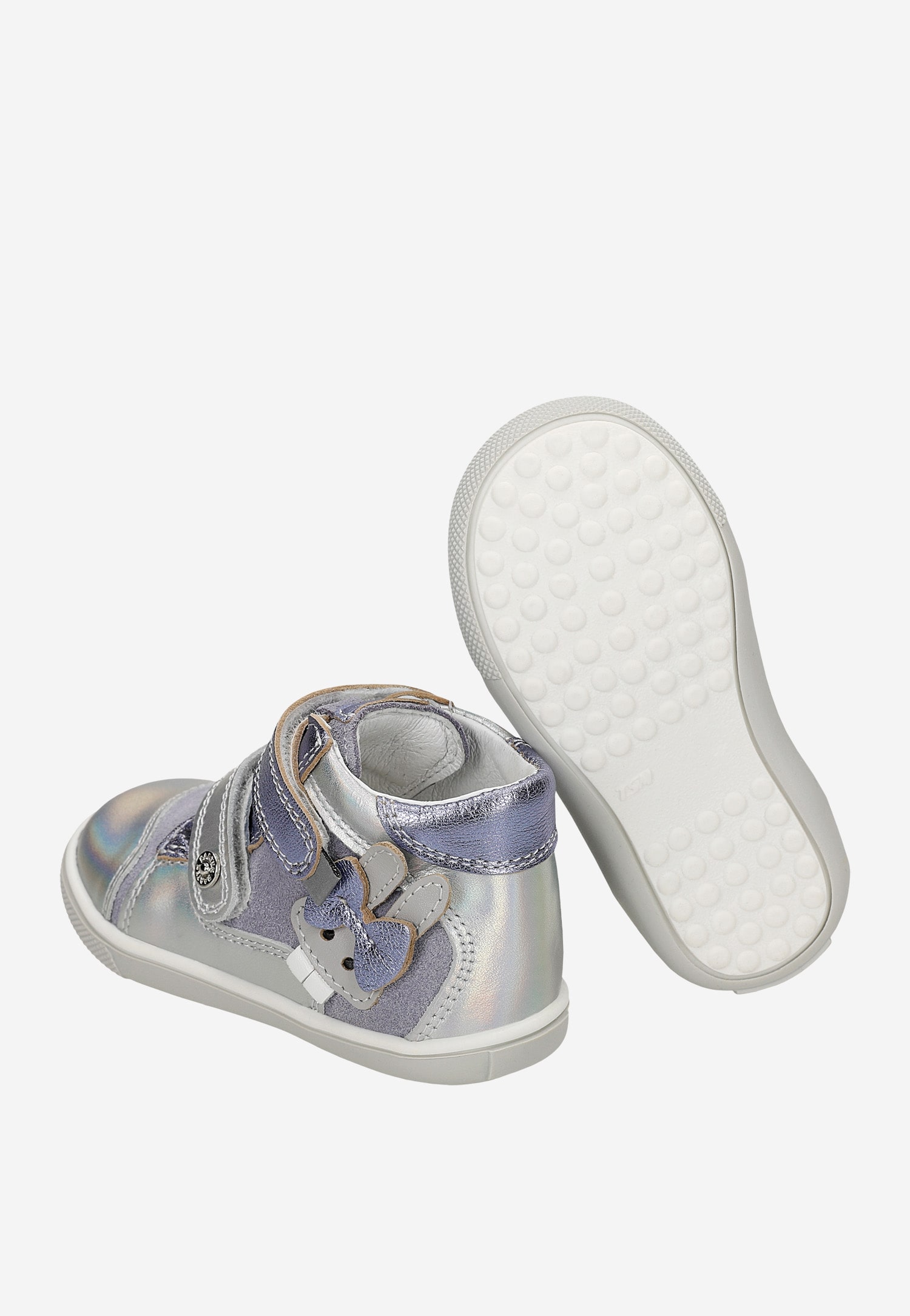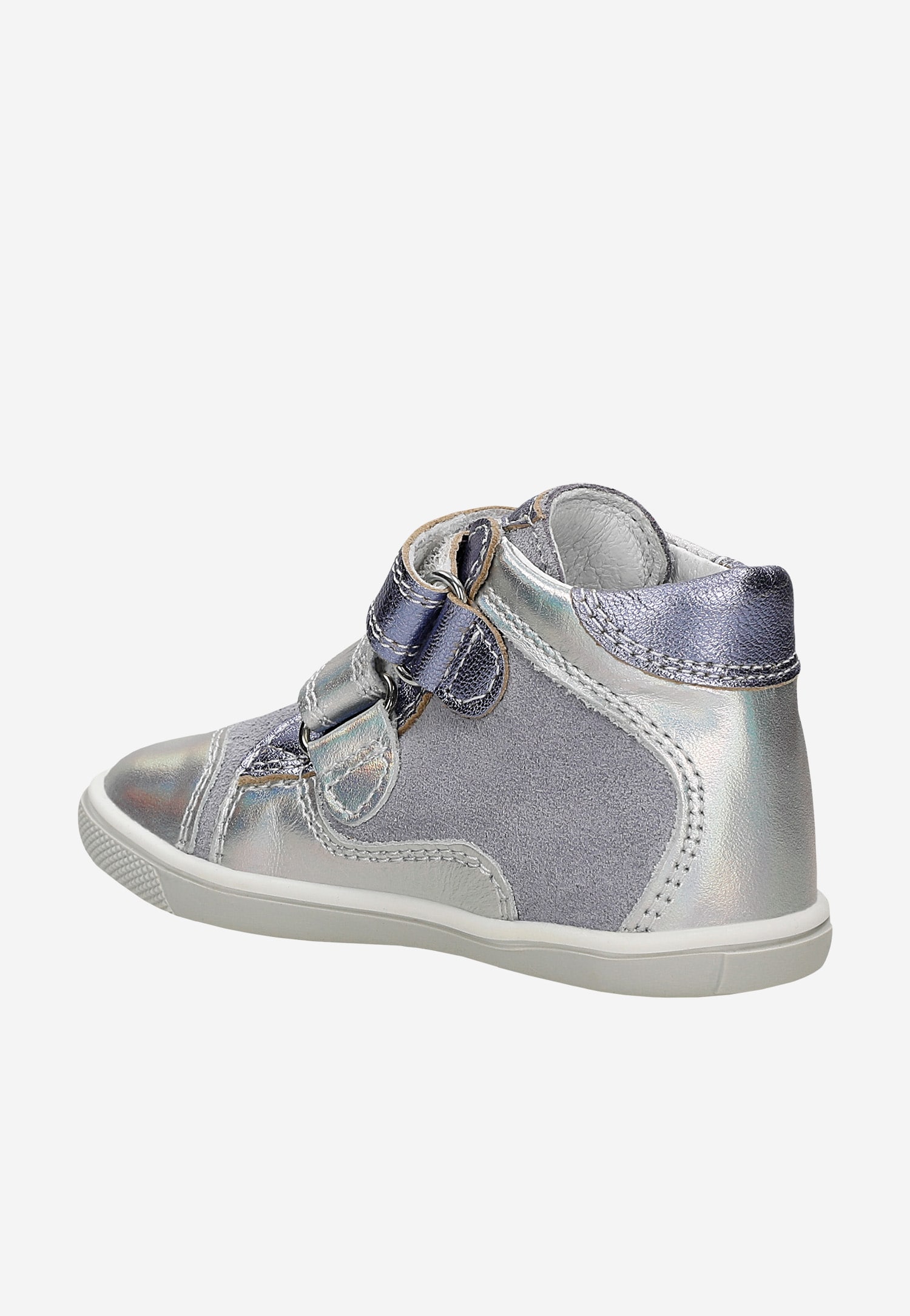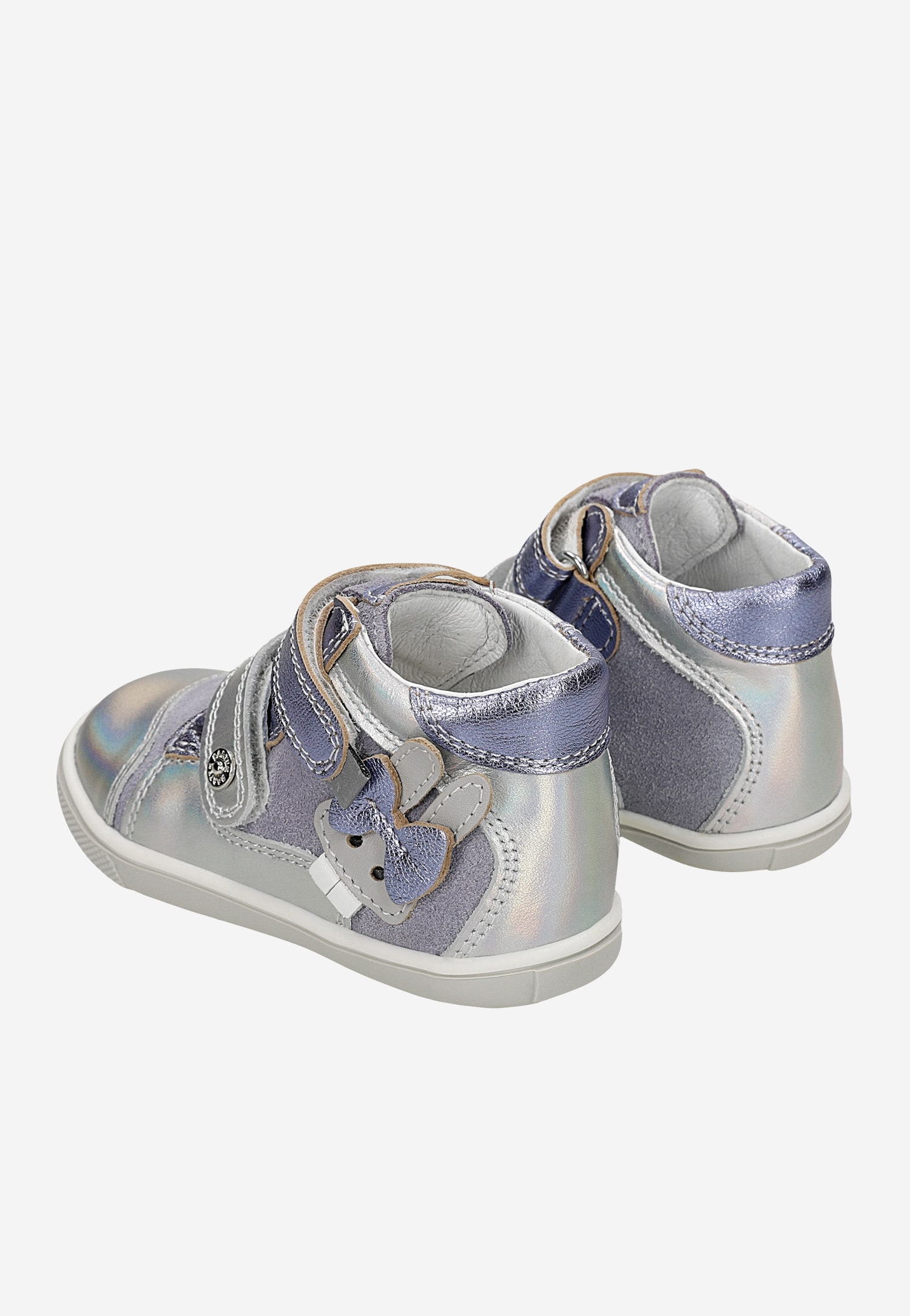 Odpowiednio wysoka cholewka z naturalnego miękkiego weluru połączonego z naturalną gładką skórą licową, posiada specjalne zakładki zabezpieczające pięty chroniąc stopy dziewczynki przed skręceniem a wykończenie mięciutkim piankowym kołnierzem chroni kostki przed obtarciami.