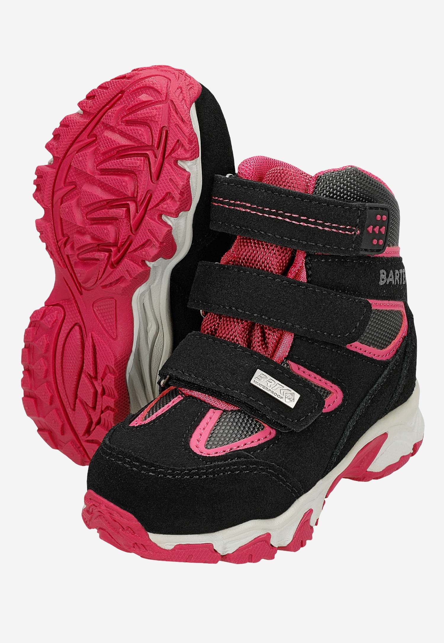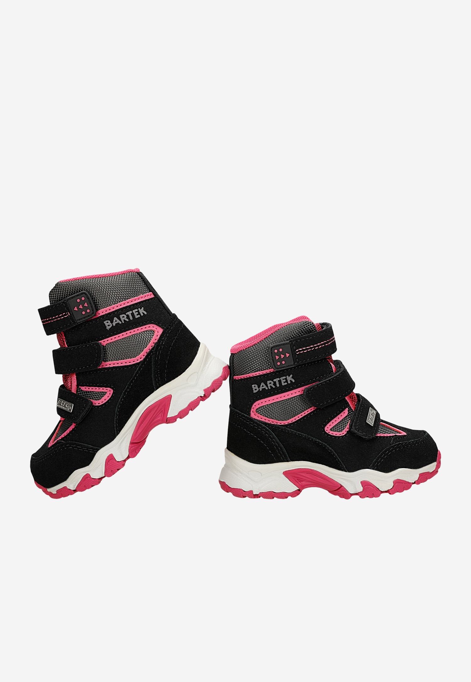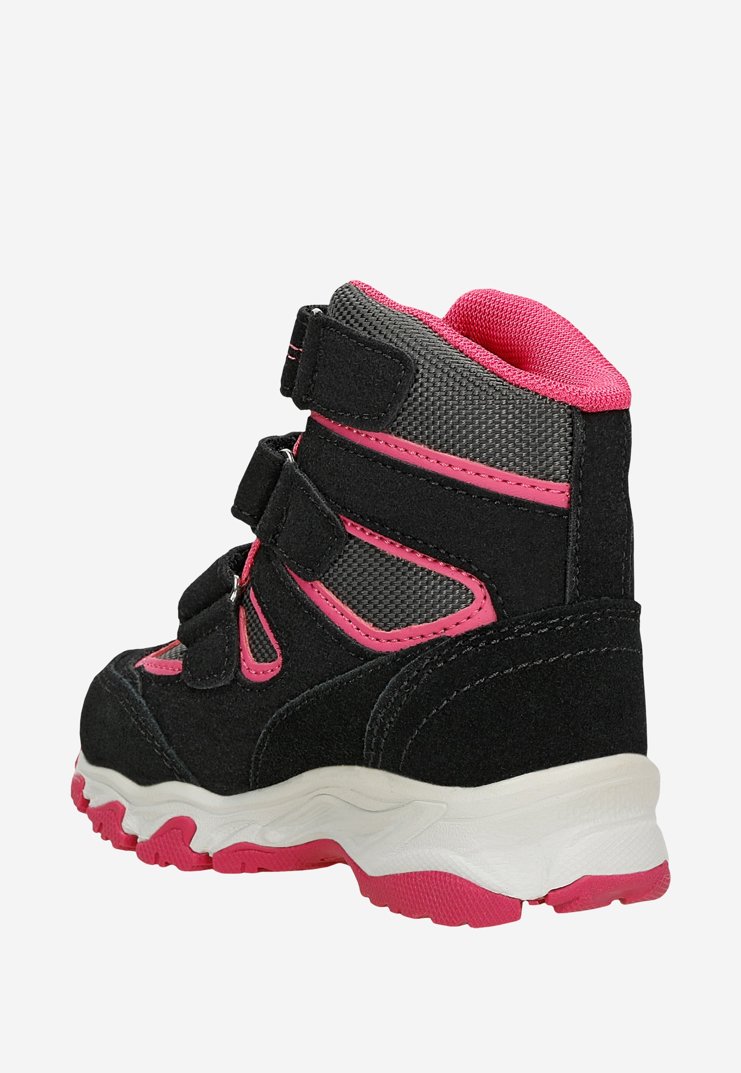 Modne, komfortowe, wygodne buciki, w czarno-różowym kolorze, zapinane na regulowane rzepy, zapewnią dobre samopoczucie podczas zabaw, wędrówek, spacerów i biegania po pokrytej śniegiem nawierzchni.