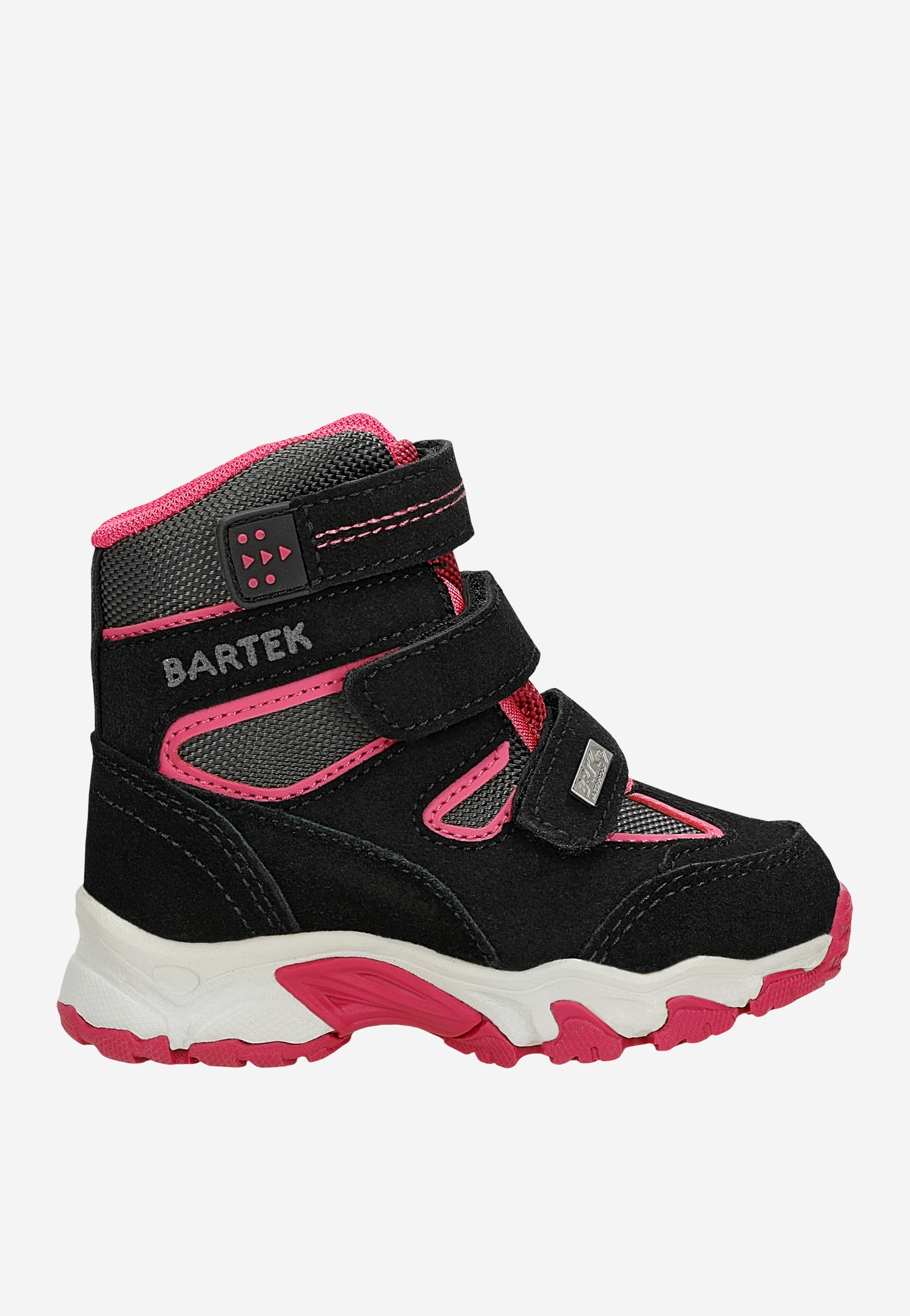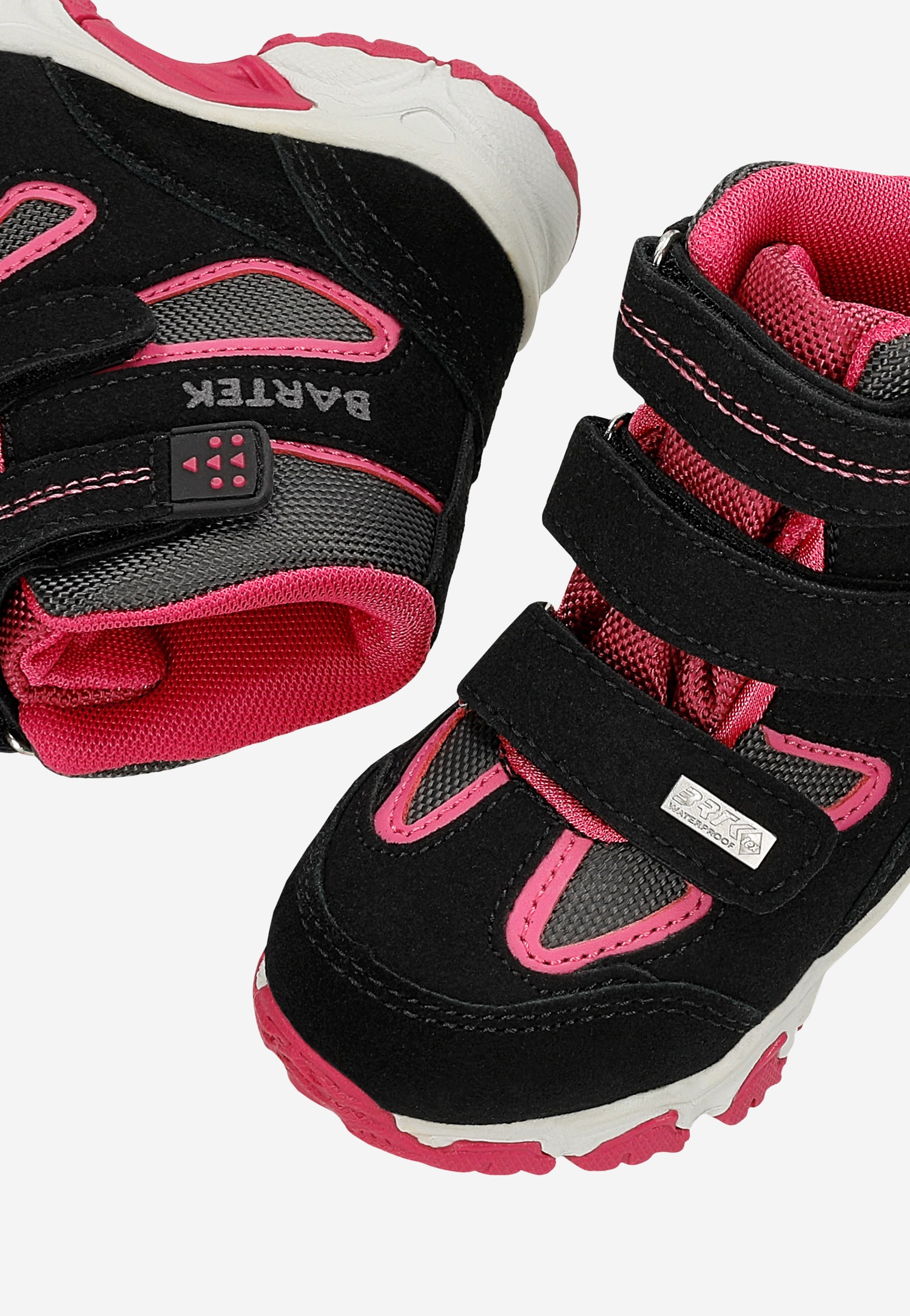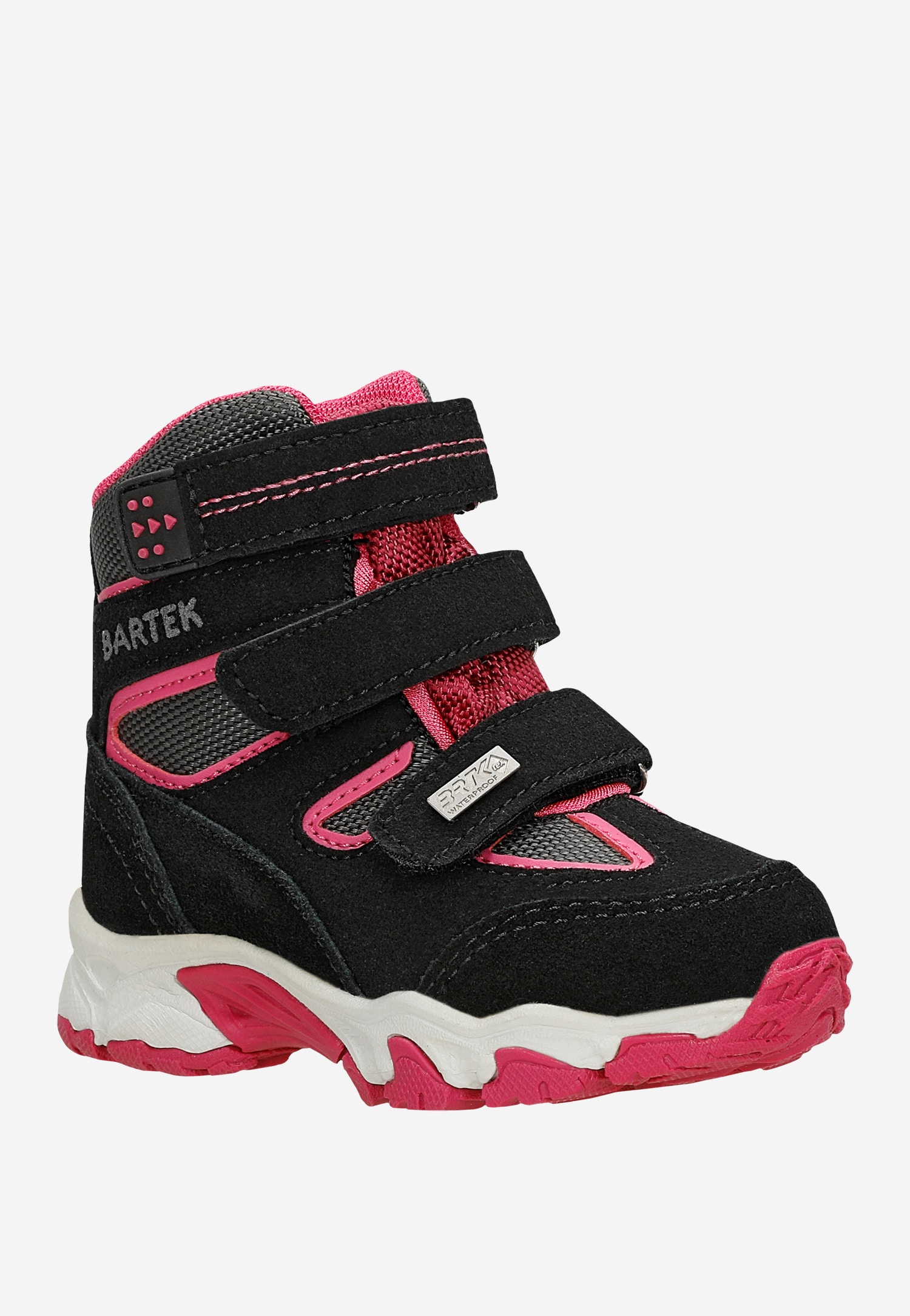 Modne, komfortowe, wygodne buciki, w czarno-różowym kolorze, zapinane na regulowane rzepy, zapewnią dobre samopoczucie podczas zabaw, wędrówek, spacerów i biegania po pokrytej śniegiem nawierzchni.